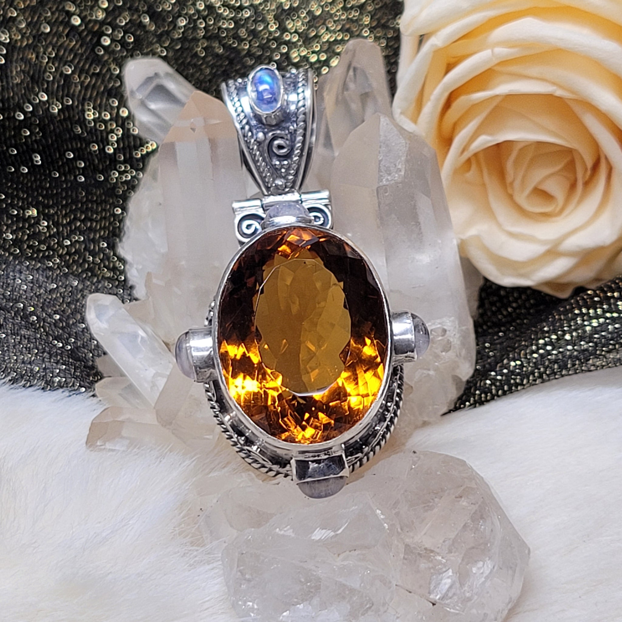 焦糖色巴西黃水晶+藍月亮S925純銀吊墜