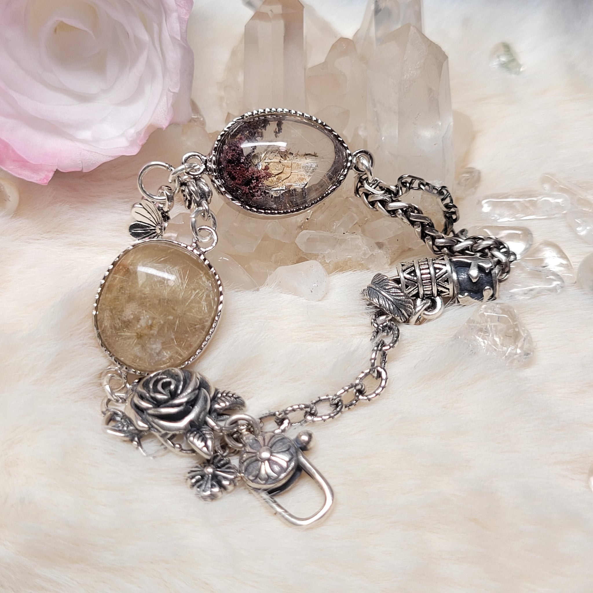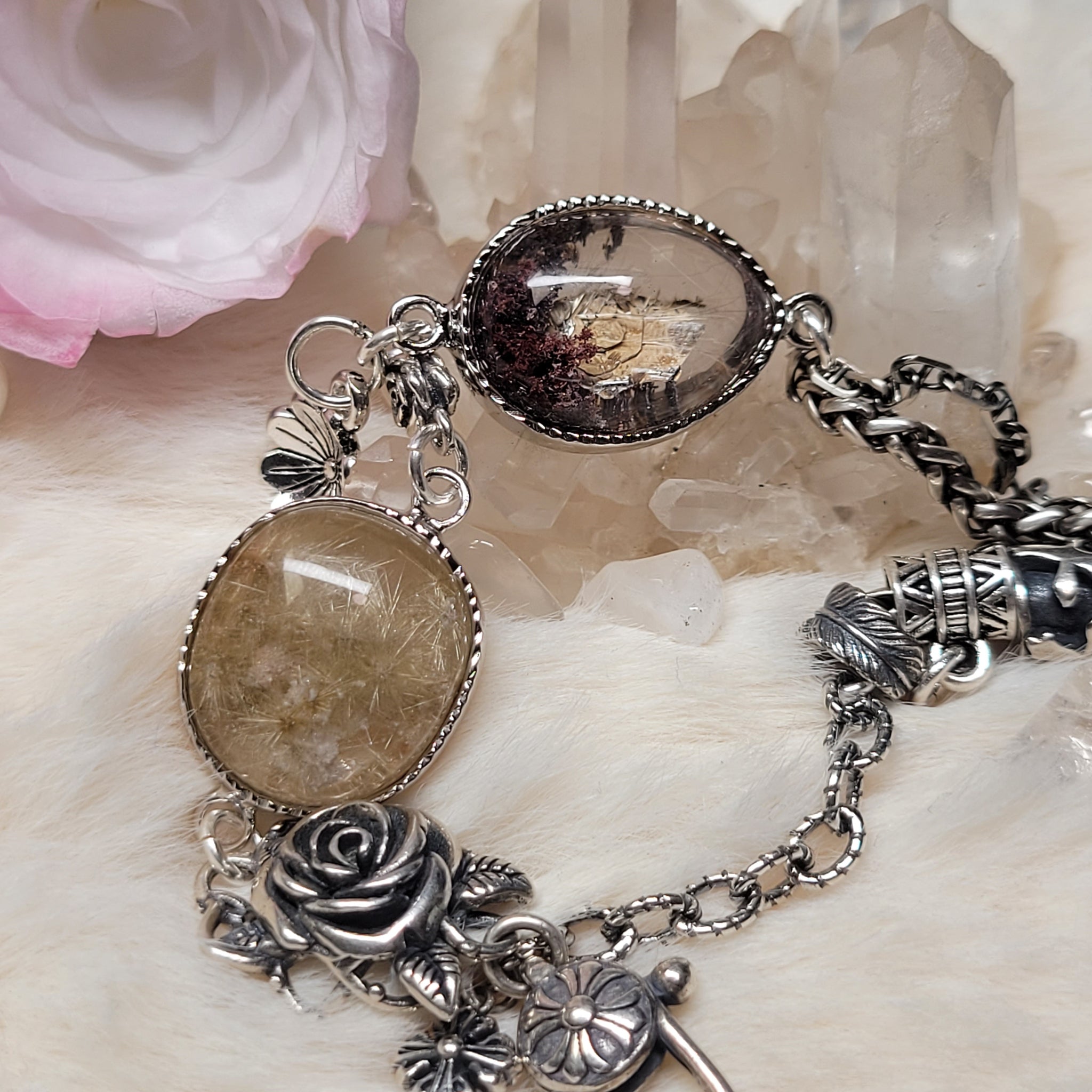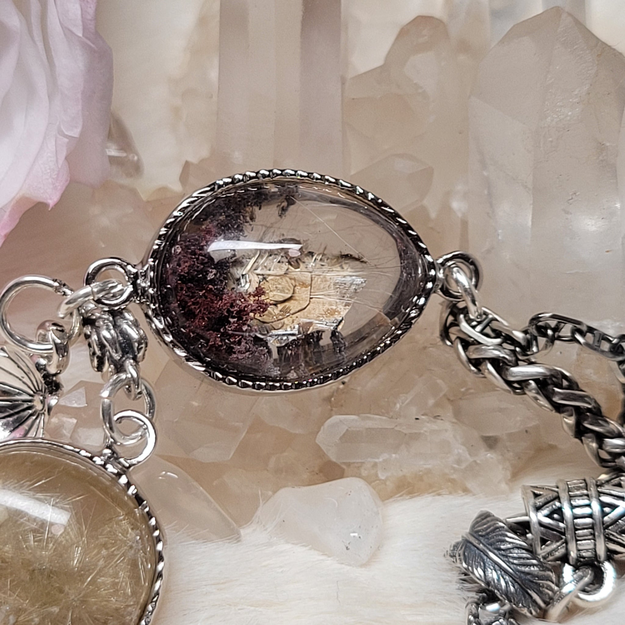 金雲母幽靈共生礦,鈦晶花2粒S925純銀設計款手鏈