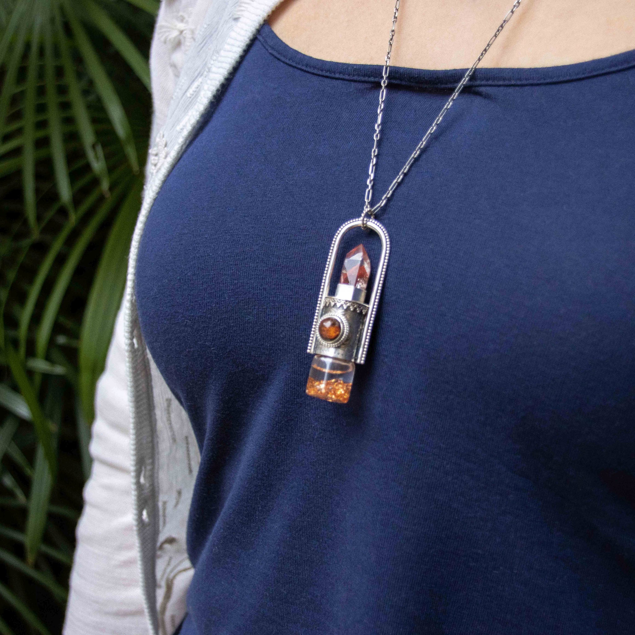 This Black Leaf themed sterling silver necklace is the second of four types of the Fountain Autumn series. It consists of an inverted U shape hanger and includes a Red Pyramid Phantom quartz cap surrounded by a bezel that sits on top of a Black Leaf pattern design together with facing Phantom quartz. A work of art to house your favorite oils.