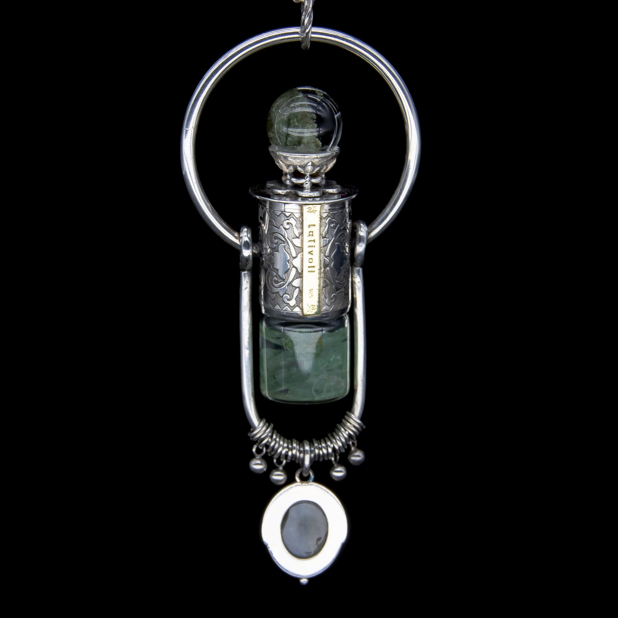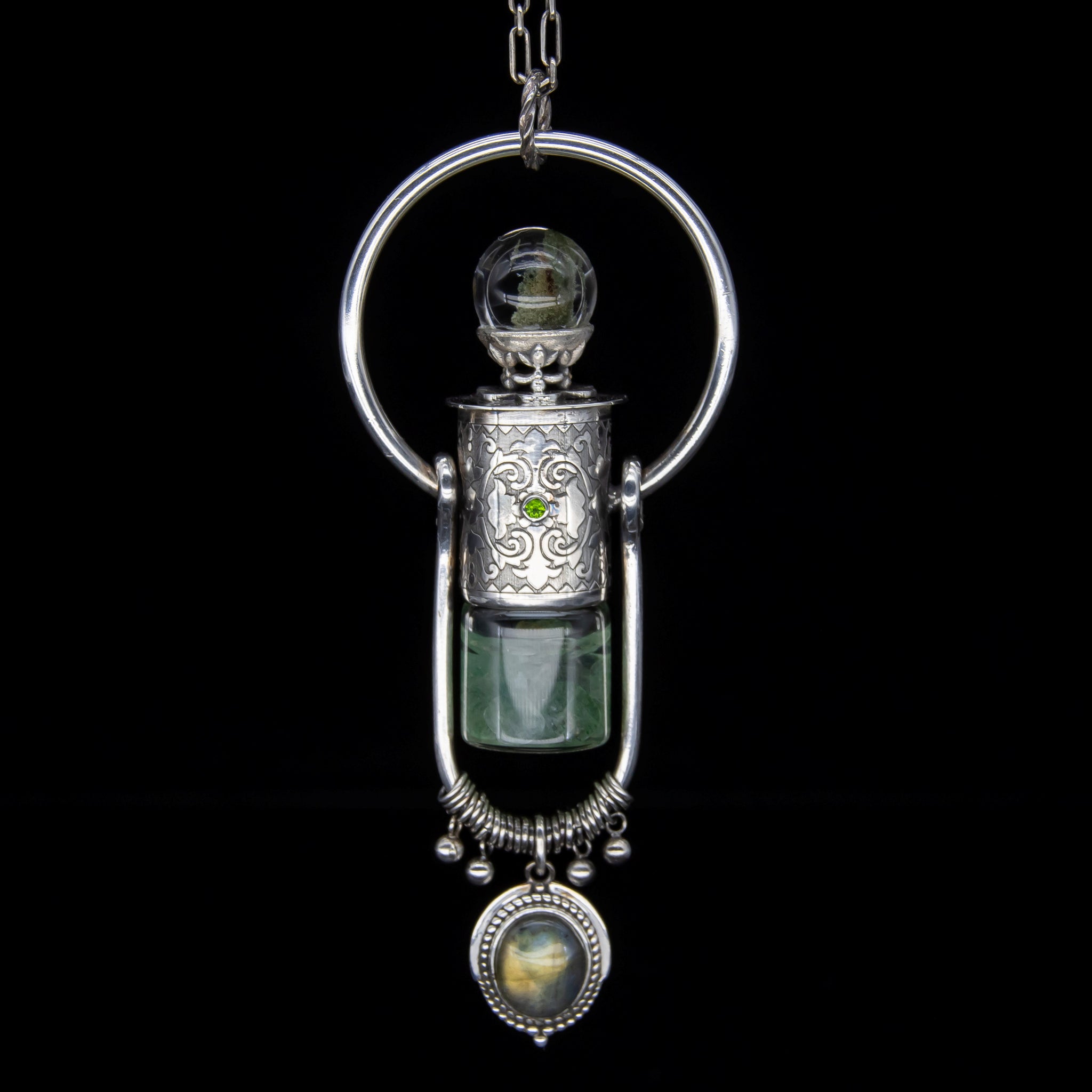This Retro themed sterling silver necklace is the third of five types of the Fountain Gem series. It consists of a sphere shape Phantom Quartz standing on a crown that sits on top of a Retro pattern design with an embedded Tourmaline Crystal. A decorative baby pendant with an embedded Labradorite Quartz hangs from the bottom.