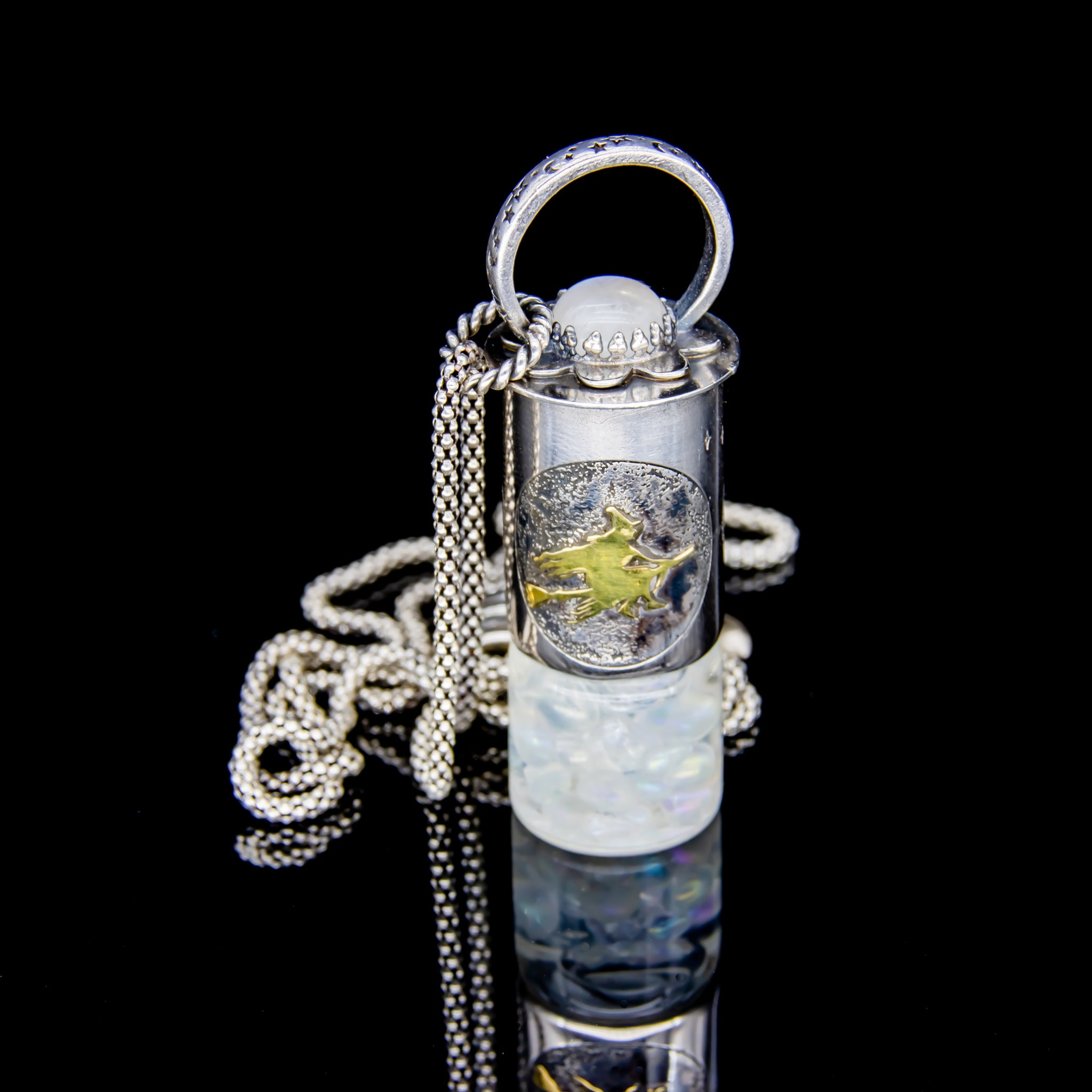 This beautifully designed series of handmade sterling silver necklace provides you with a choice of Black Onyx & Moonstone gemstone caps surrounded by an antique bezel that sits on top of our Earth • Moon • Orbit pattern design lid with a golden colored witch on broomstick. A work of art to house your favorite oils.